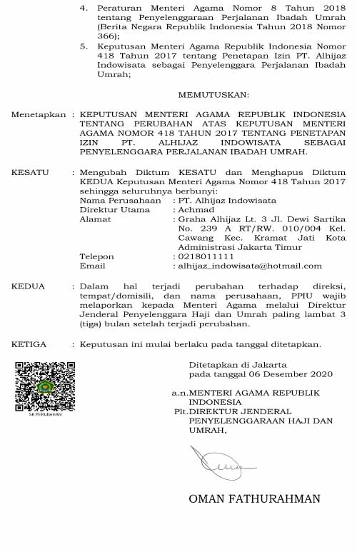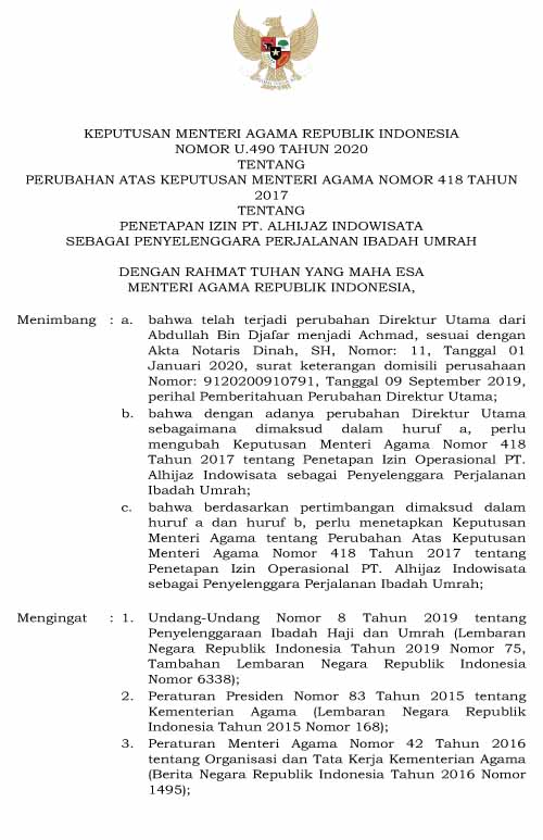 Izin Umrah : No. 490 Tahun 2020