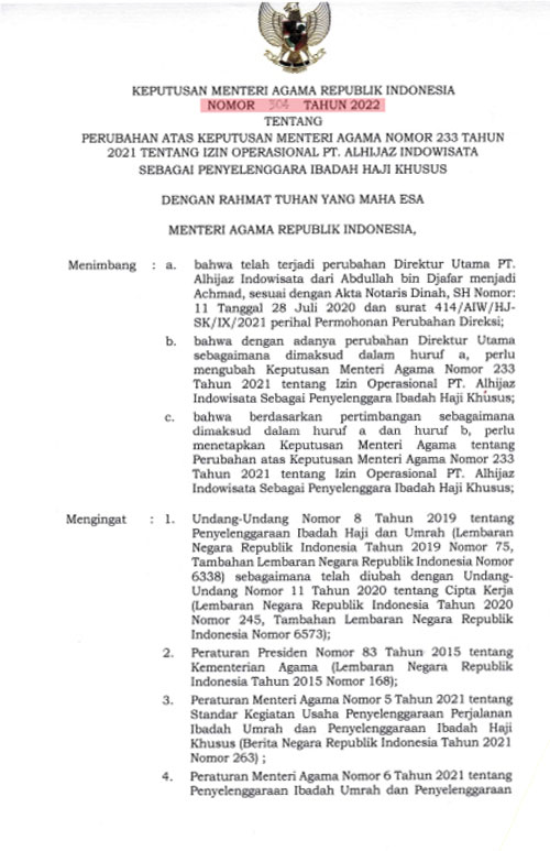 Izin Haji : No. 304 Tahun 2022